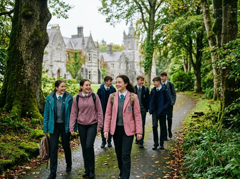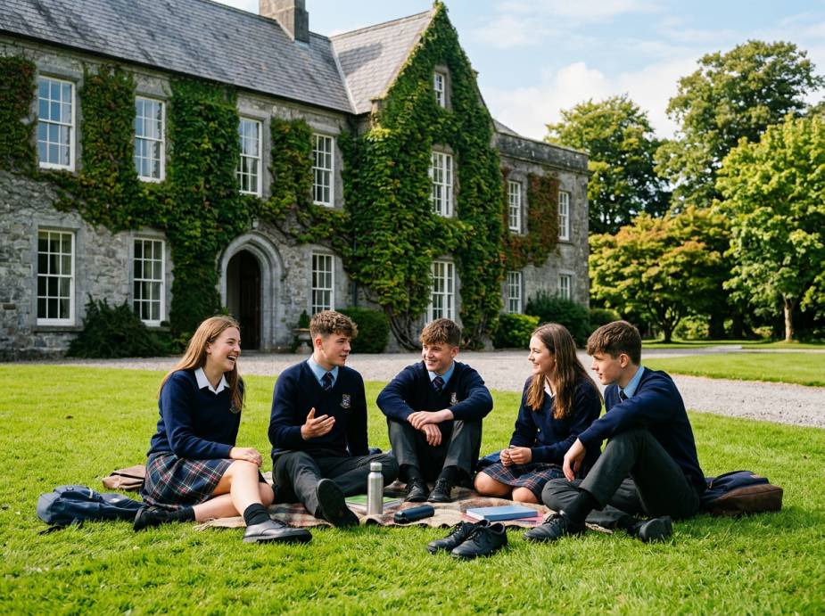 Среднее образование. В ирландских школах-пансионах царит более свободная атмосфера, чем в британских. Классы небольшие — в среднем 10–15 человек. Учебный день включает не только академические занятия, но и спорт, творчество и кружки. Школьные резиденции уютные, часто с неформальным, почти семейным общением между учениками и воспитателями. Учебный план разнообразен: от обязательных предметов (английский, математика, естественные науки) до выбора из десятков опций, включая бизнес, экономику, бухгалтерский учёт, биологию, химию, физику, музыку, искусство, дизайн и графику. После уроков — спортивные мероприятия, музыкальные классы, походы в театры, музеи и галереи. Ежегодно для учеников организуются зарубежные туры, в том числе по США, Франции, Германии, Италии и Бельгии.