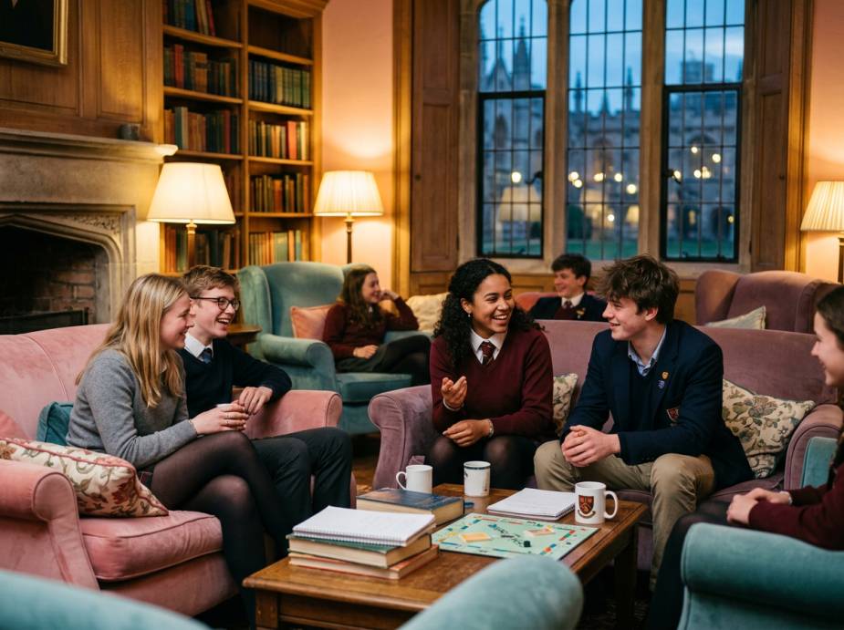 Ученики живут в резиденциях — их называют «домами» (houses). У каждого дома своё имя, свой цвет, иногда даже гимн. Младшие (7–11 лет) обычно живут по 4–6 человек в комнате, средняя возрастная группа (11–14) — по 2–4, старшие (14–18) получают одноместные или двухместные. В здании есть общая гостиная с диванами и телевизором, кухонька с чайником и микроволновкой, прачечная. Воспитатели (house parents) живут тут же — проверяют уроки, следят, чтобы все легли спать, решают ссоры. Режим плотный: подъём в 7 утра, завтрак, занятия с 9 до 15–16, потом спорт или кружки, ужин, самоподготовка под присмотром, отбой в 21–23 в зависимости от возраста. В выходные — экскурсии, матчи, походы в город. На длинные каникулы (рождество, пасха, лето) пансион закрывается — ученики либо уезжают домой, либо едут в принимающие семьи (это отдельная услуга за доплату).